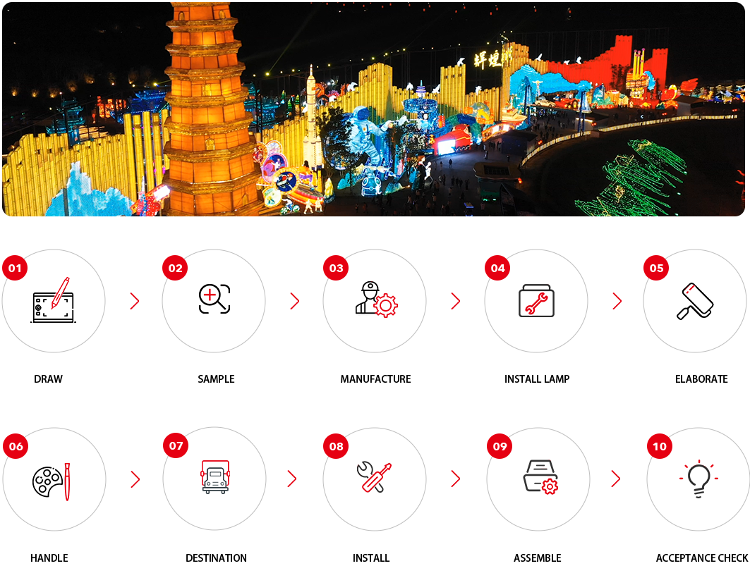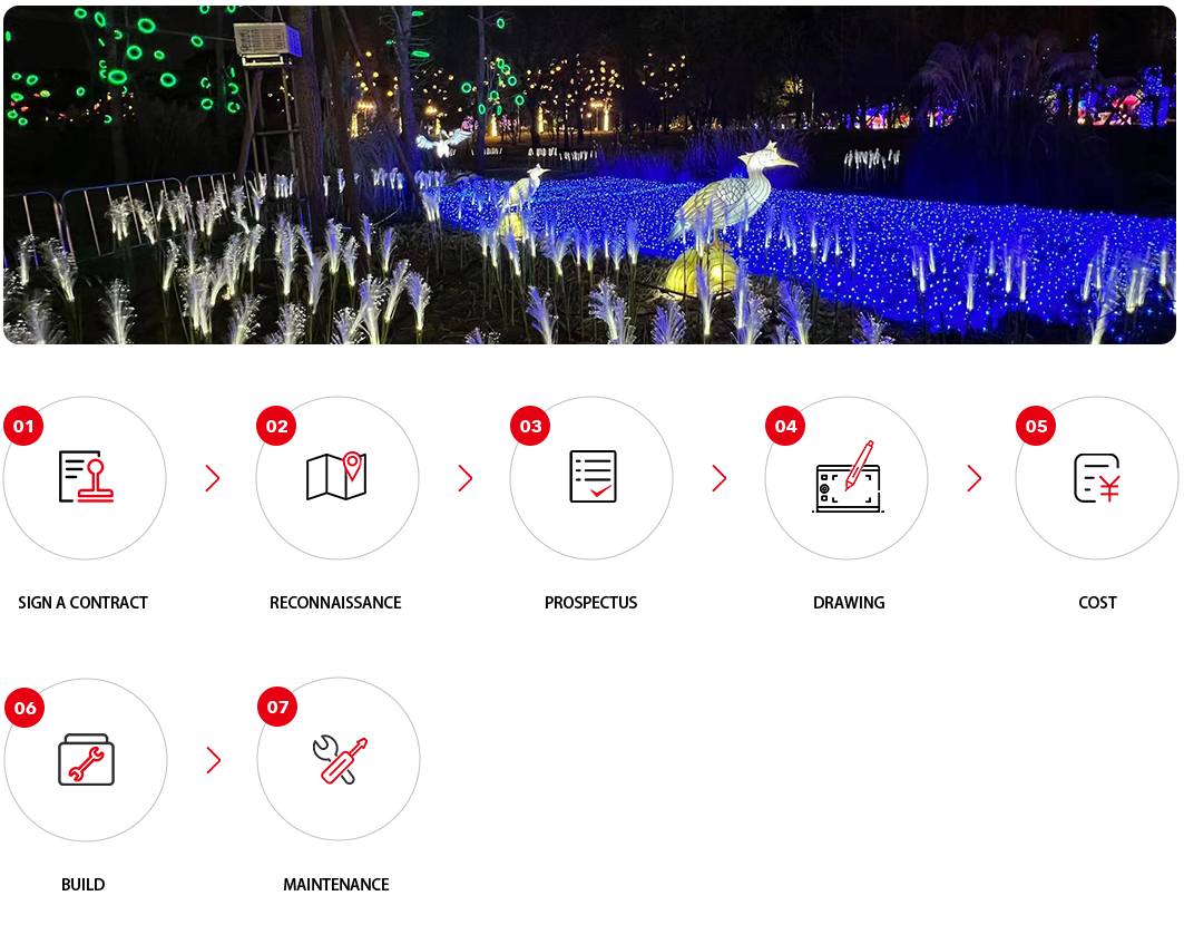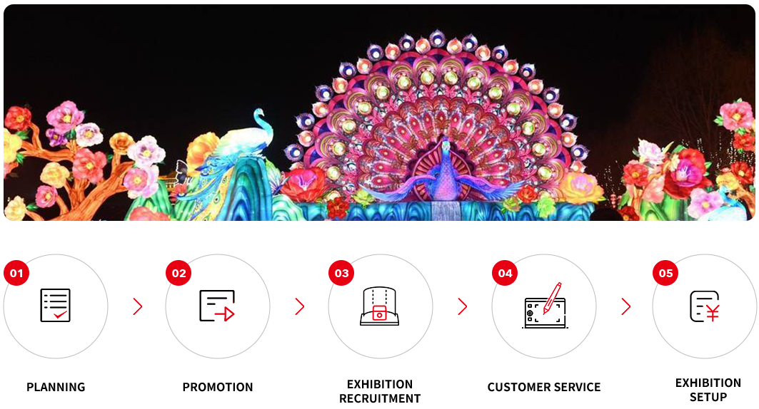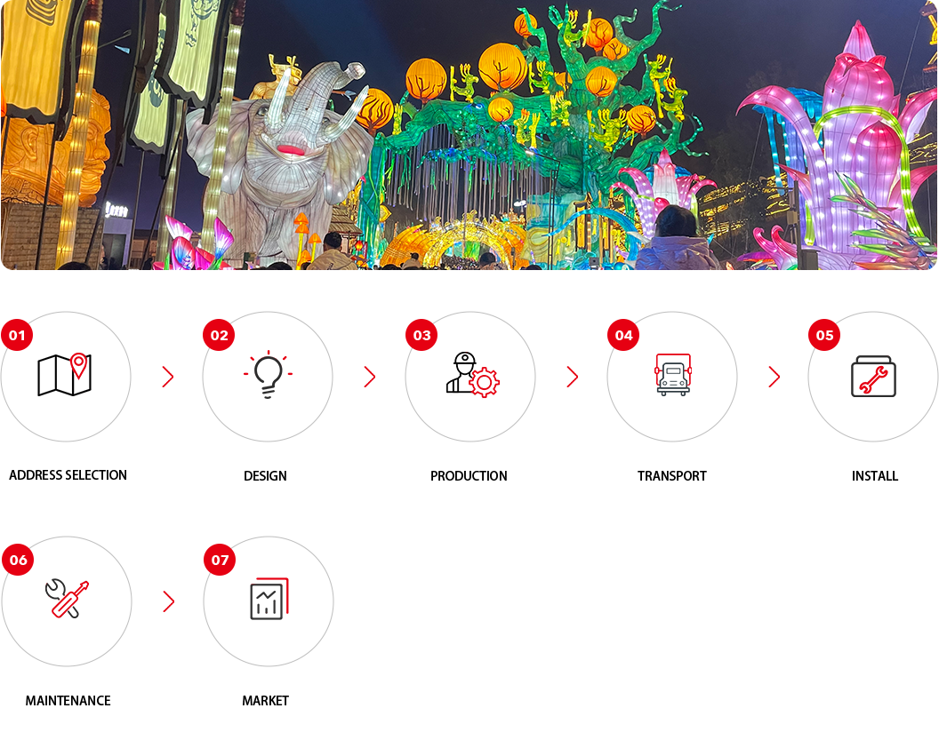 The company's professional management team has more than 30 years of management experience and a mature service system for the entire industry chain of the lantern festival. It is engaged in the entire industry chain business content including venue selection, lantern design, production, transportation, installation, exhibition, exhibition, sales, etc.