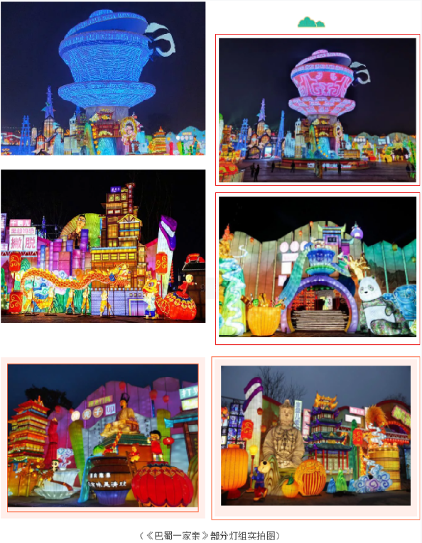 今年,自貢·中華彩燈大世界以“觀自貢燈 過(guò)中國(guó)年”為主題,550畝展區(qū)、十五大主題、上百組彩燈,給游客們帶來(lái)一場(chǎng)自貢彩燈文創(chuàng)新紀(jì)元的視覺(jué)盛宴。有800多年歷史的自貢燈會(huì),開(kāi)啟全新云時(shí)代,將自貢燈會(huì)打造成展現(xiàn)時(shí)代風(fēng)貌的大舞臺(tái),讓您足不出戶也能領(lǐng)略“天下第一燈”的魅力!由燈貿(mào)集團(tuán)創(chuàng)意、設(shè)計(jì)團(tuán)隊(duì)等數(shù)百名彩燈匠人歷時(shí)兩個(gè)多月精心打造的《巴蜀一家親》、《自貢記憶》、《五糧液》三個(gè)大型燈組?!栋褪褚患矣H》薈萃川渝各城風(fēng)貌之靈光,主體以獨(dú)具特色的川渝茶文化代表——蓋碗茶為載體,現(xiàn)代透光材質(zhì)制作憨態(tài)可掬的熊貓,下方高鐵環(huán)繞而行,輔以巴蜀特色元素,將自貢傳統(tǒng)彩燈制作工藝與新技術(shù)相結(jié)合,為游客帶來(lái)可看、可聽(tīng)、可聞的沉浸式的觀燈體驗(yàn)。