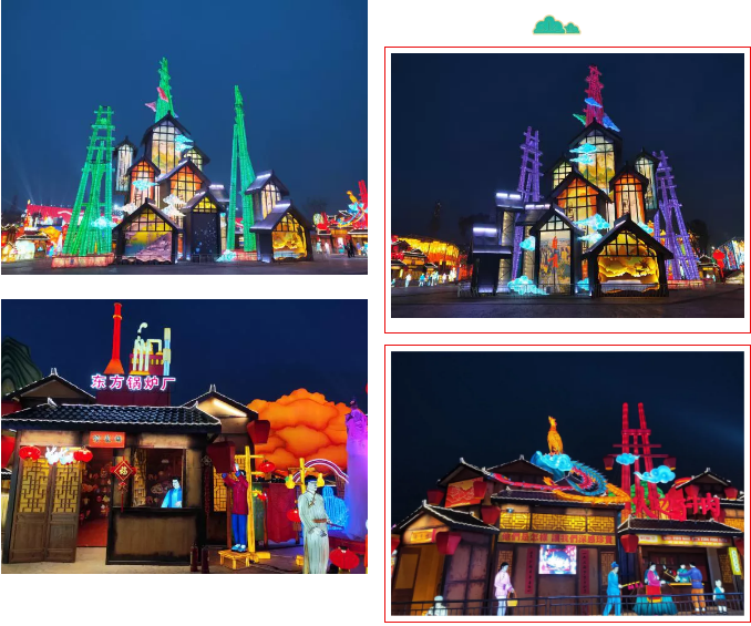 《自貢記憶》主燈組使用傳統(tǒng)材質(zhì)結(jié)合現(xiàn)代工藝,宏偉的天車獨(dú)創(chuàng)性的使用啤酒瓶制作,配合追光變色形成絢麗奪目的燈光效果。顯示屏剪影式表現(xiàn)自貢元素。恐龍穿行、錦鯉游動(dòng),還有靈活靈現(xiàn)的自貢歷史場(chǎng)景和人物,還原了一幅原滋原味又生動(dòng)的老自貢記憶。