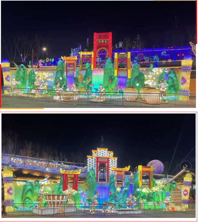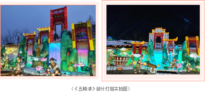 《五糧液》主燈組采用第八代五糧液酒瓶運(yùn)用自貢彩燈傳統(tǒng)工藝?yán)υ删扌臀寮Z液,輔以仙山、仙境、巨龍騰越氛圍闡釋五糧傳奇,杯酒時(shí)光,百年味道。周邊群燈組展示封存在時(shí)光中的“活窖池”--利川永、張萬(wàn)和、劉鼎興、天賜福、聽(tīng)月樓、全恒昌等八家明代釀酒作坊,歷史悠久的古窖池群講述著傳承幾百年的五糧液釀酒工藝,折射幾千年氤氳酒香的中國(guó)酒歷史和酒文化。